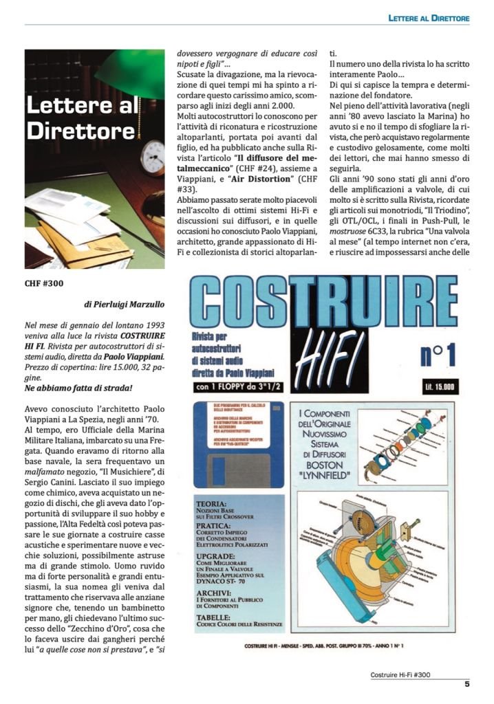 Insomma vari mesi di lavoro per preparare e far uscire il primo numero di COSTRUIRE HIFI, progettato, pensato, scritto e voluto integralmente da Paolo Viappiani… oggi, più di TRENTUNO anni dopo siamo qui a presentarvi questo numero 300, con quasi il triplo delle pagine (84 pagine contro le 32 di allora), con molta meno pubblicità del settore (non c’è quasi più alcun negoziante in Italia a vendere componenti elettronici per l’audio!) e soprattutto con un prezzo che è immensamente più basso di quello di allora!